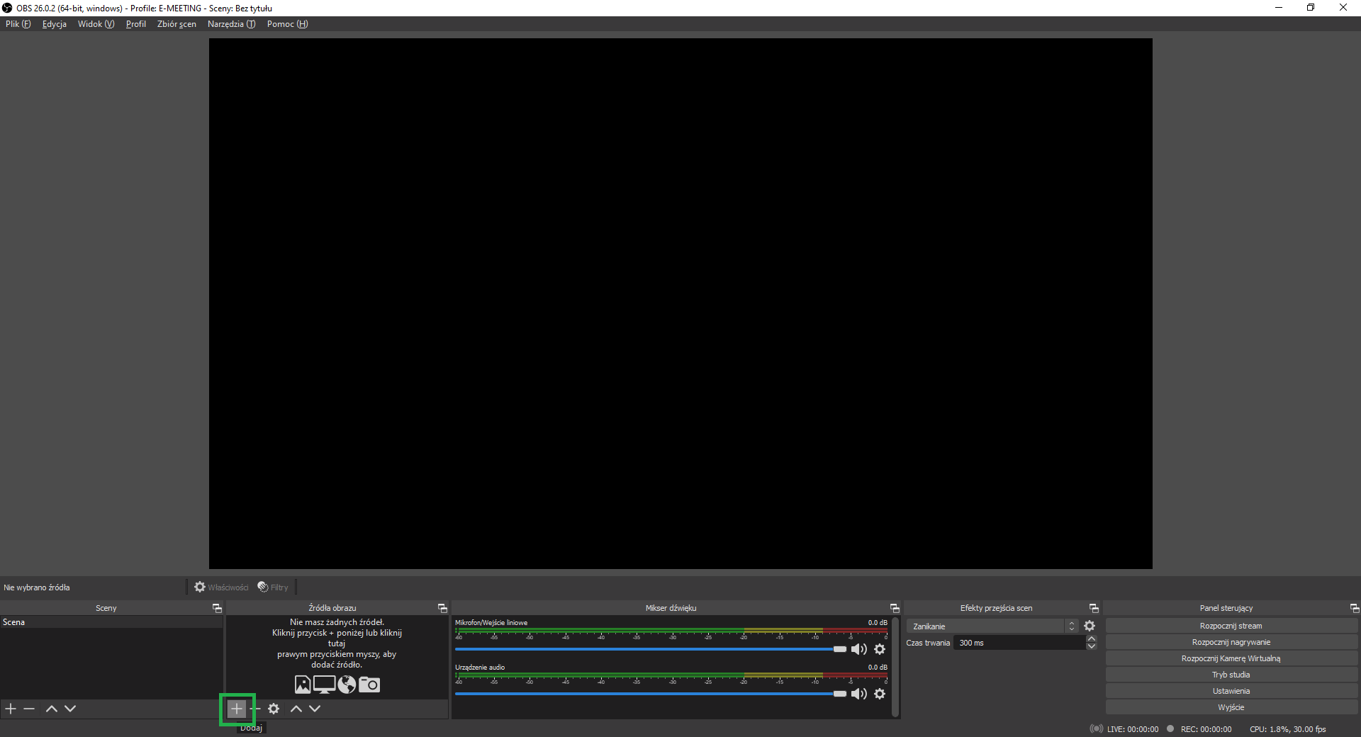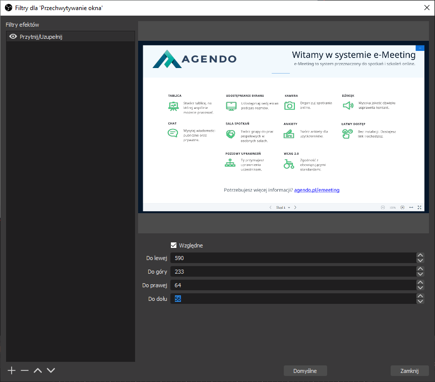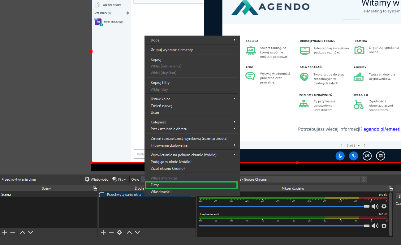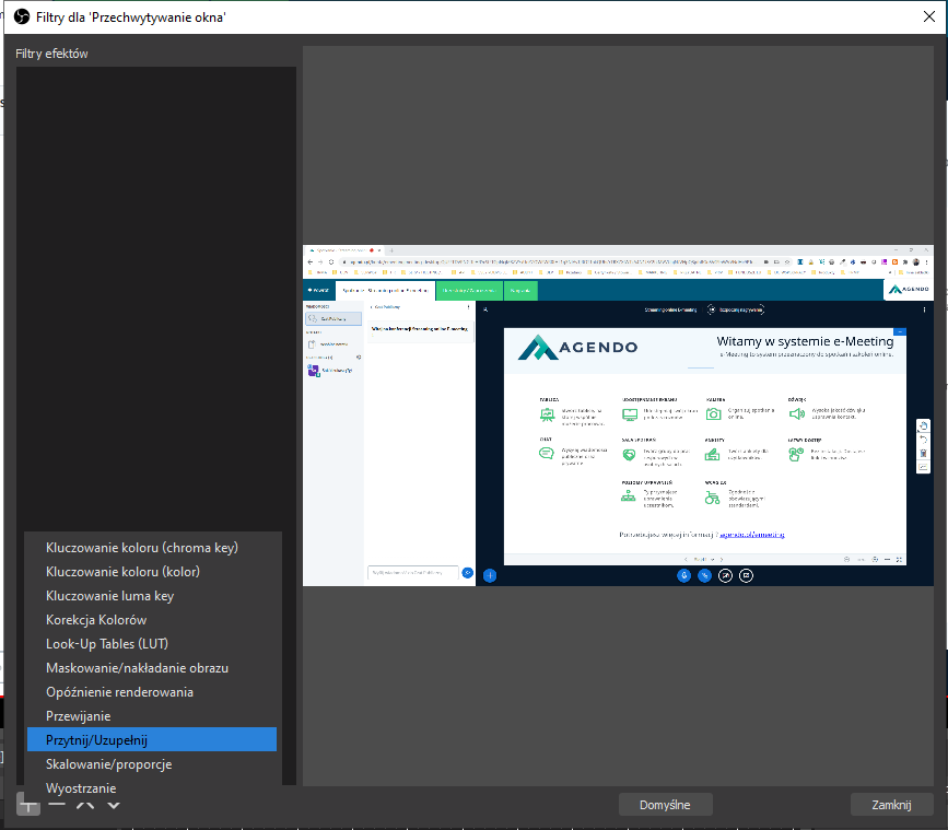 Skonfiguruj OBS Studio tak by przedstawiał przeglądarkę w której uruchomione jest spotkanie w E-meeting, w tym celu: