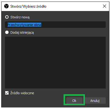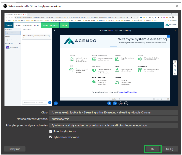 W ustawieniach przechwytywania okna wybierz odpowiednie okno z spotkaniem E-meeting które zostało wcześniej utworzone, a następnie kliknij OK