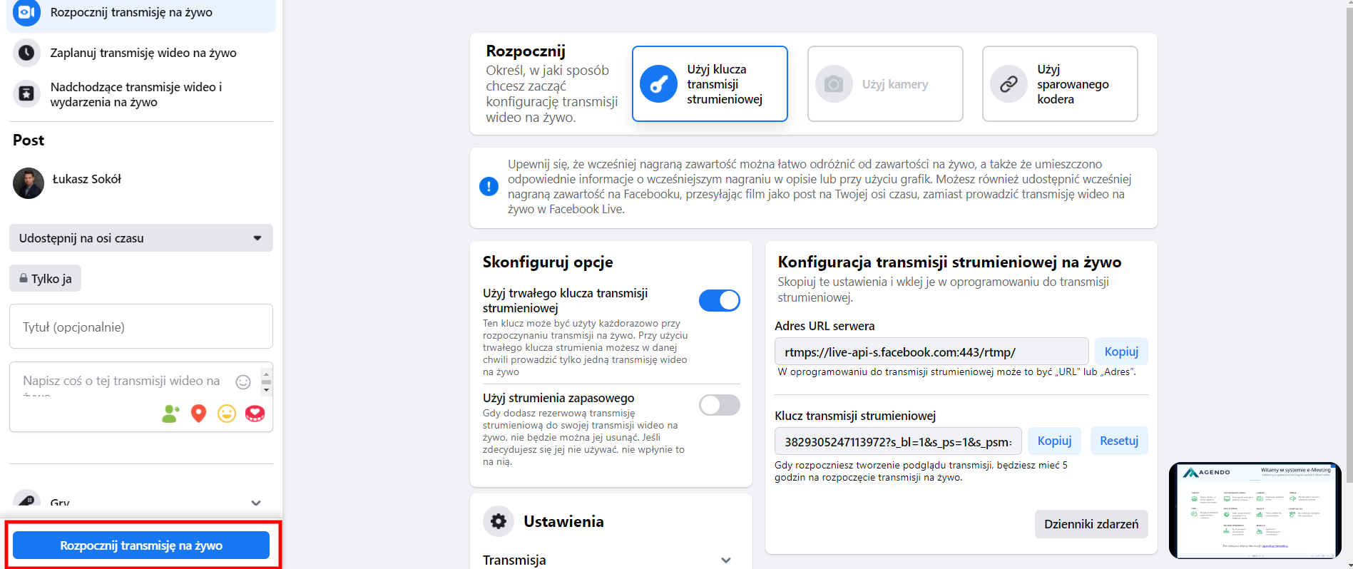 Kliknij przycisk rozpocznij transmisję na żywo