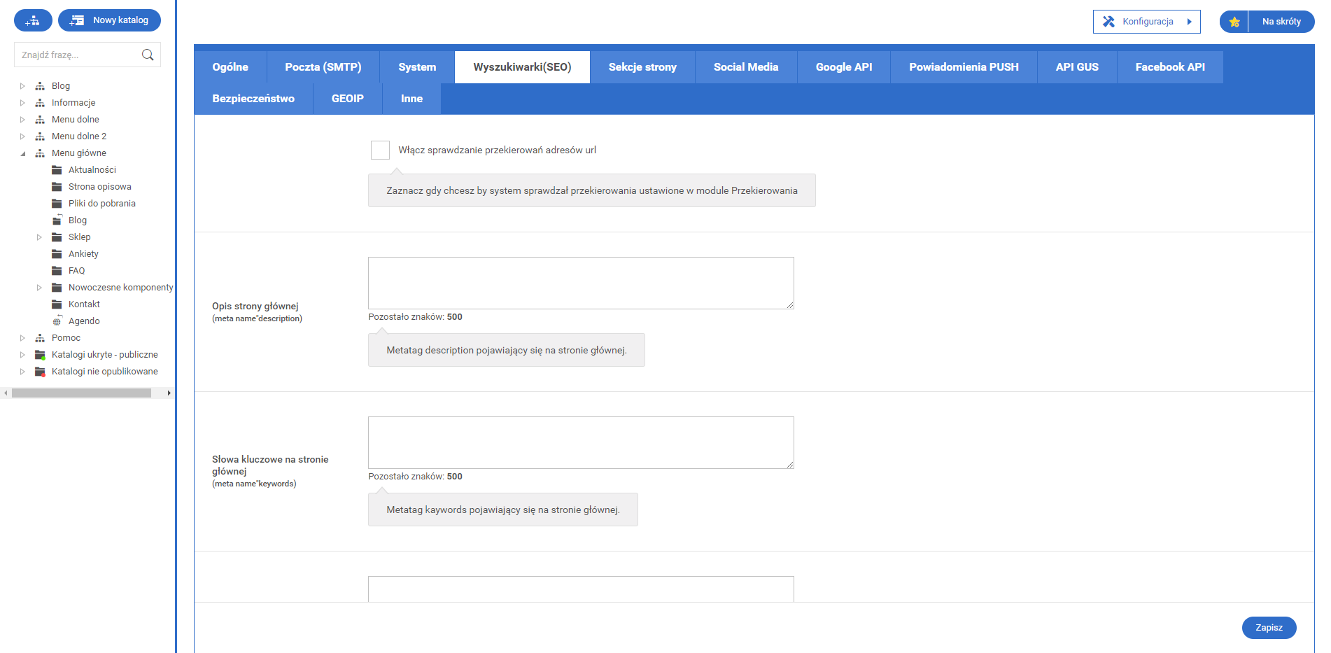 Zestaw funkcji wspomagających optymalizację strony. Dodatkowo moduł przekierowań i zmian statusów pomoże kontrolować wszelkie zmiany na stronie i monitorować ewentualne błędy serwisu.